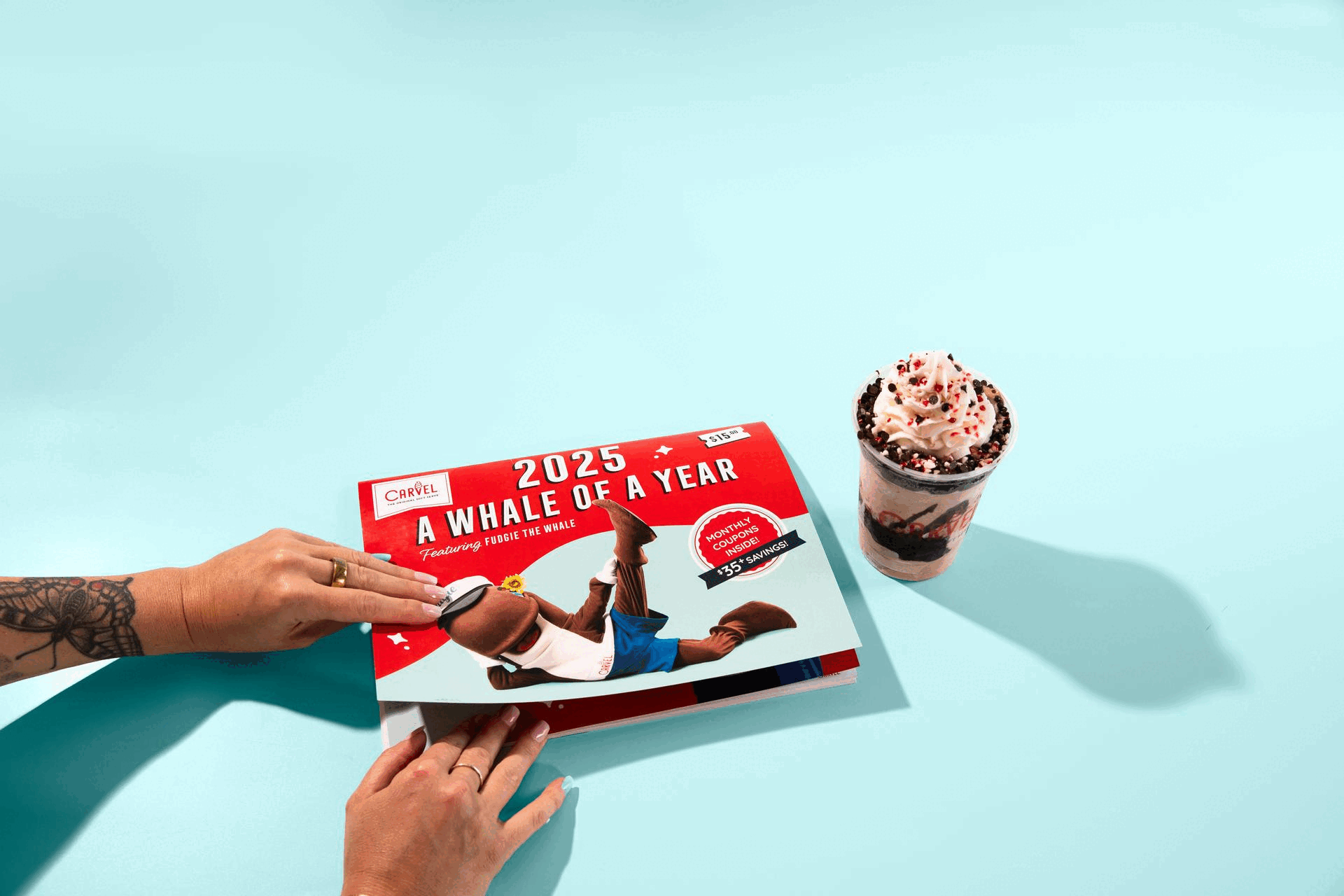Fudgie finally got his own centerfold moment—only this time, it’s twelve of them. We shot him in hundreds of poses and built out playful, photoshopped scenes to create Carvel’s 2025 calendar, packed with details for fans to discover all year long as well as coupons for each month.